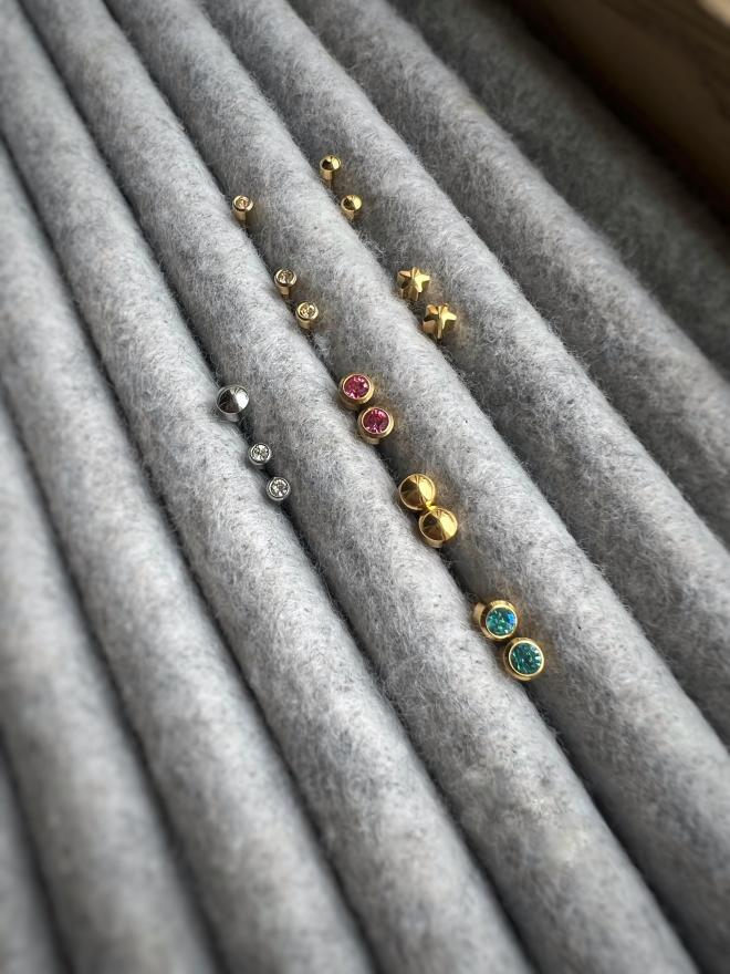 Napichovacie náušnice, ktoré sú do ušného lalôčika aplikované, sú vyrobené z chirurgickej ocele a pozlátené 24-karátovým zlatom a sú vhodné aj pre bábätká.