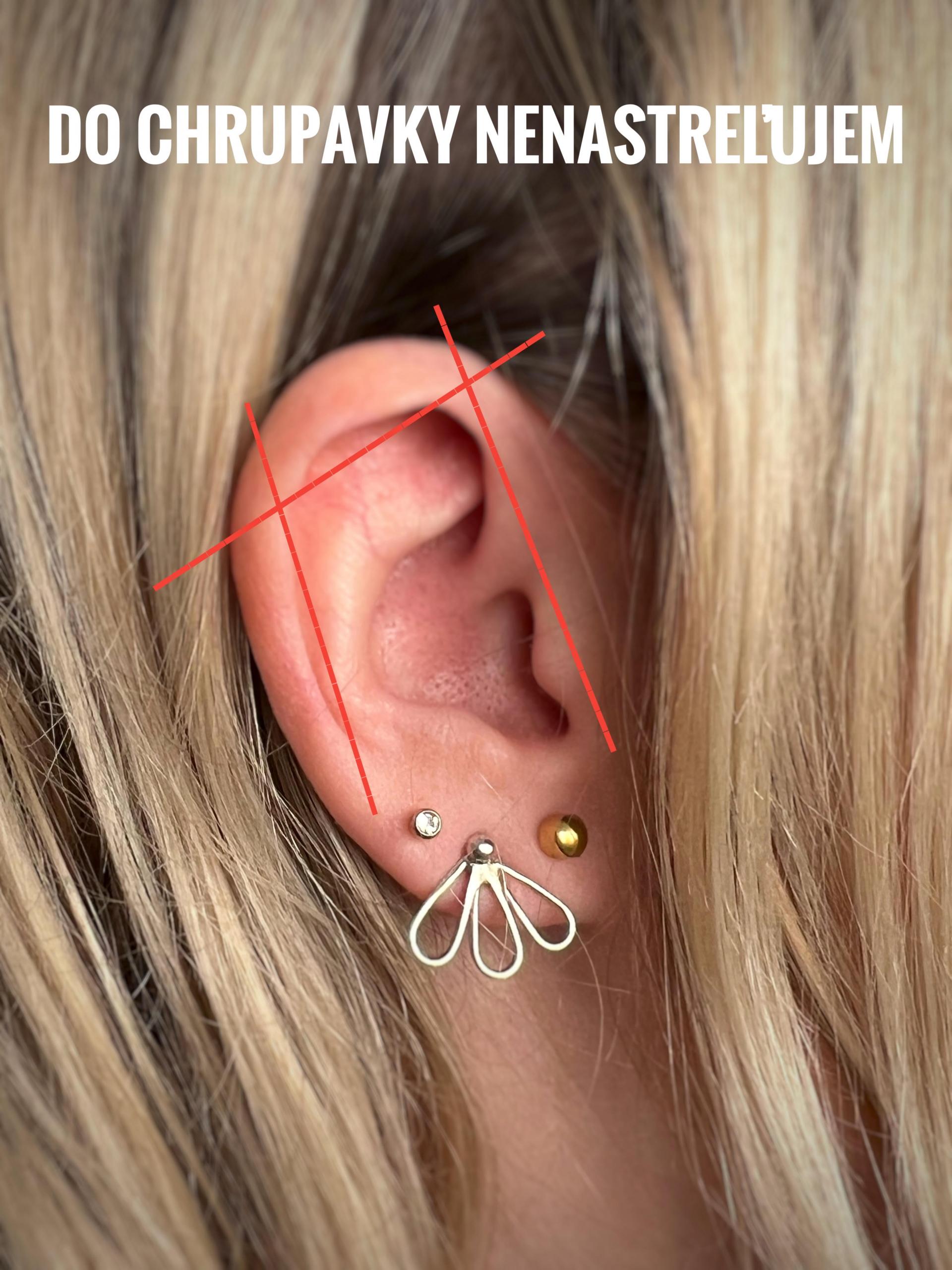 Nenastreľujem do chrupavky (horná časť ucha) – viď foto nižšie.